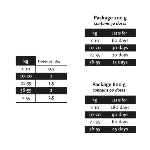 20 kg kaaluva looma päevane kogus sisaldab 1400 mg omega-3 EPA-d ja DHA-d, 600 mg glükoosamiinvesinikkloriidi, 400 mg kondroitiini ja 50 mg looduslikku E-vitamiini.
